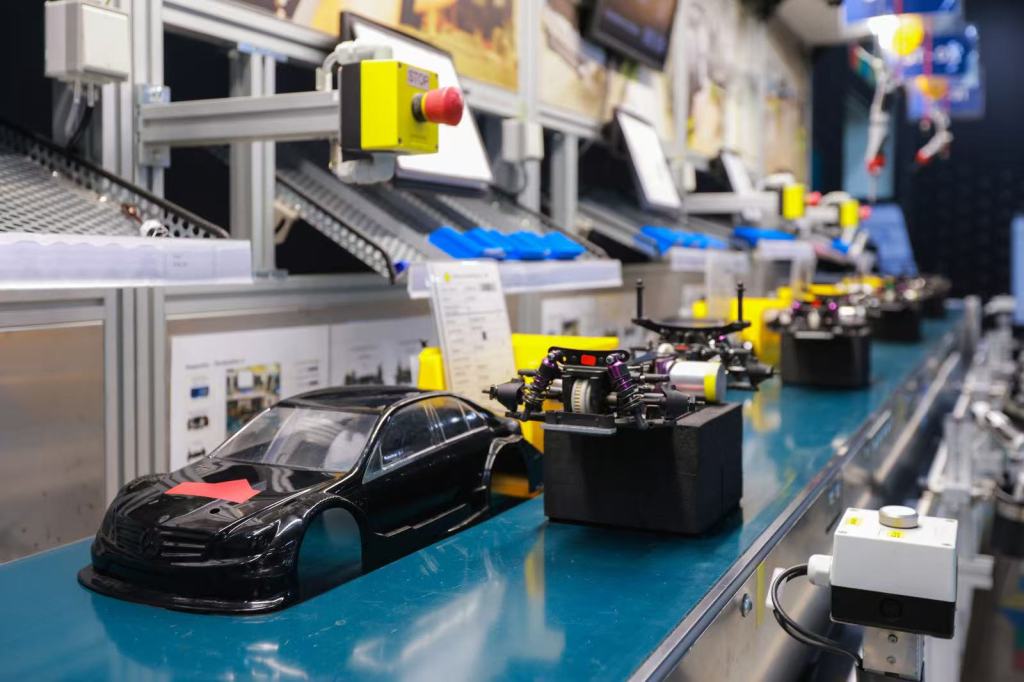数十个人被分为若干组,有焊装、有涂装、有物流运输等,各司其职。虽然是微缩流水线,但生产系统监控屏幕、工位上的传送带、计件传感器、打螺丝的电动工具应有尽有。